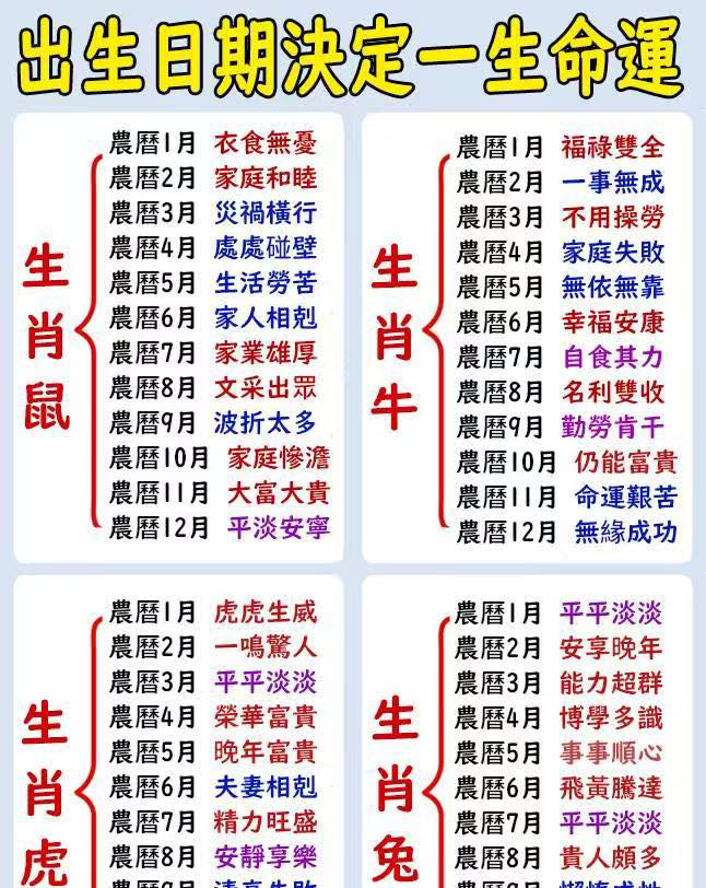 | 12月 | 磨練富貴 | 中年後發 | 老有所依 | 財運平平 | 衣食無憂 | 家庭和睦 | 中年福厚 | 兒孫孝順 |