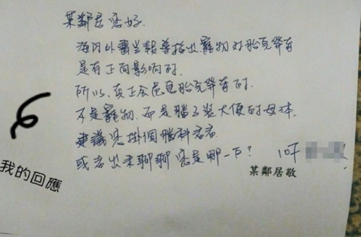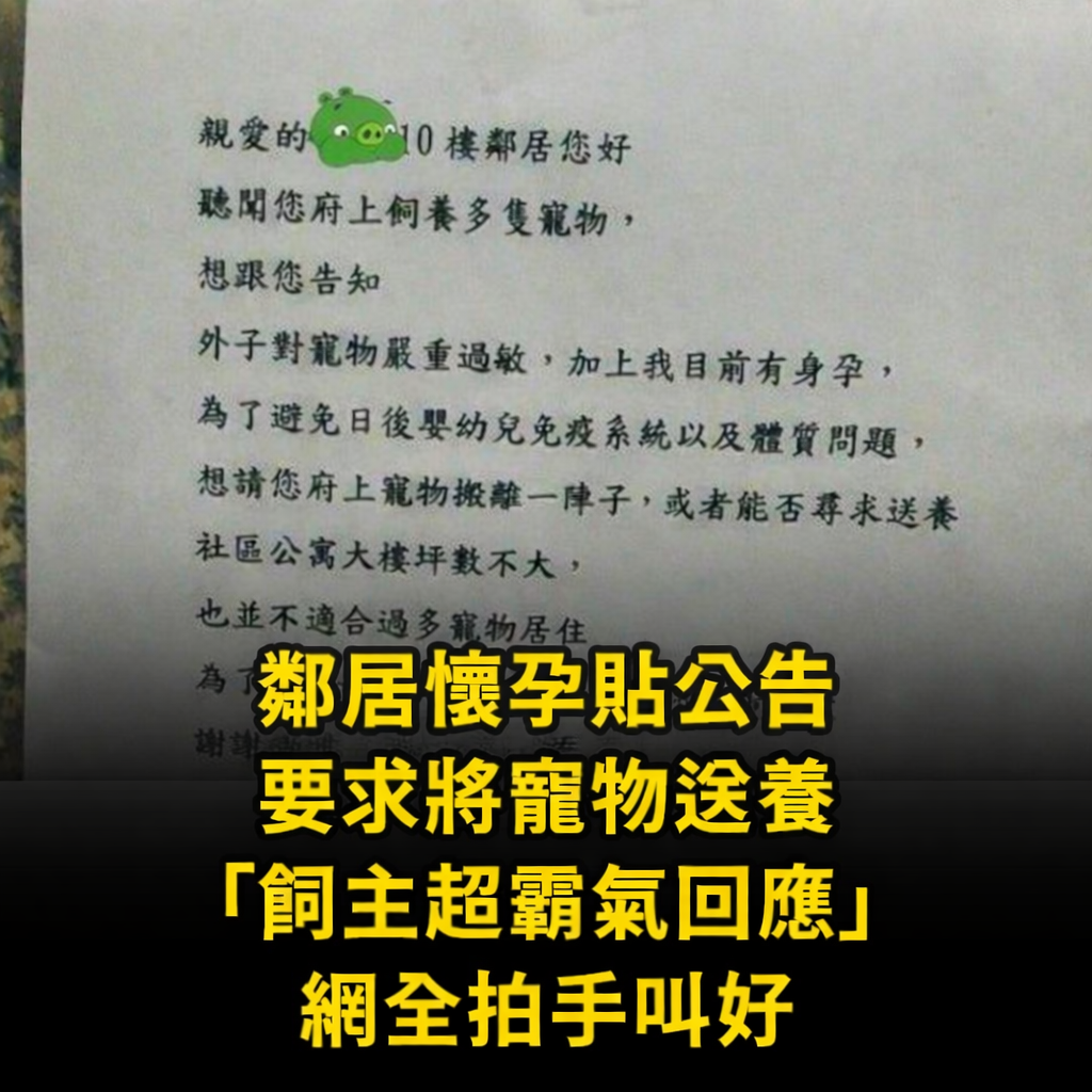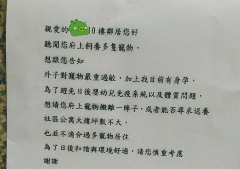 這名留下通知的鄰居表示,家中小孩對動物毛屑有嚴重過敏反應,而自己目前又正懷孕,得知同棟住戶飼養多隻寵物後,開始擔心未來嬰幼兒的體質與免疫狀況,甚至認為公寓空間有限,「不適合過多動物共處」,因此希望對方能將寵物送養或另作安排,還以「為了大家日後相處融洽」作為結尾。