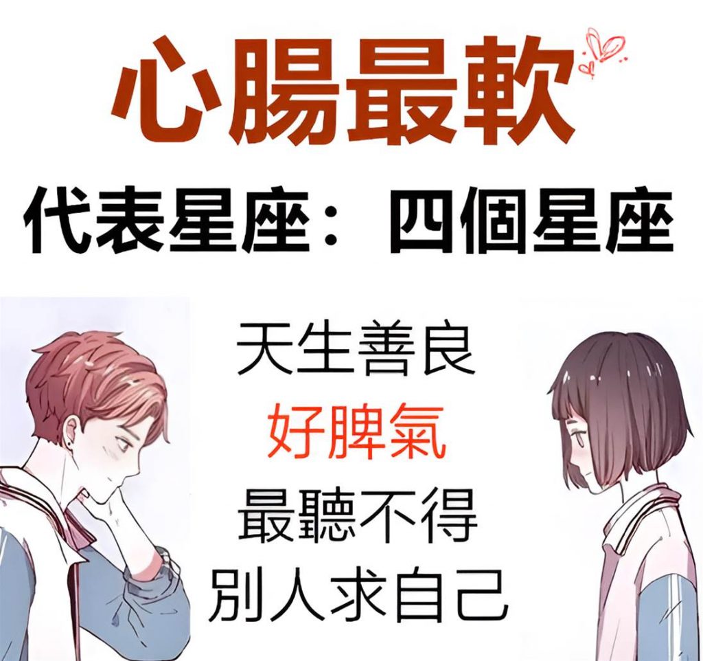 心軟表現: 哪怕是傷害過他的人,只要對方現在過得不好,巨蟹就會忍不住心生憐憫,甚至反過來檢討自己當初是不是太狠。他們的底線,總是隨著對方的一句「對不起」而後退。