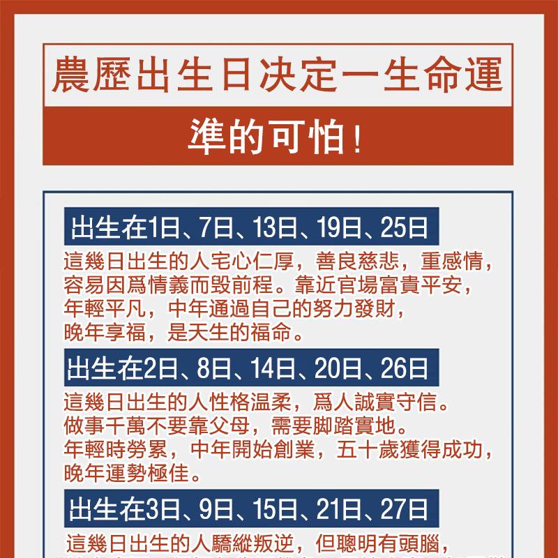 性格對照:如果您是「農曆二月或三月」出生,雖然帶點「勞碌命」特質,但若出生在「1日、7日」等吉日,則能透過中年努力轉為「享福命」。