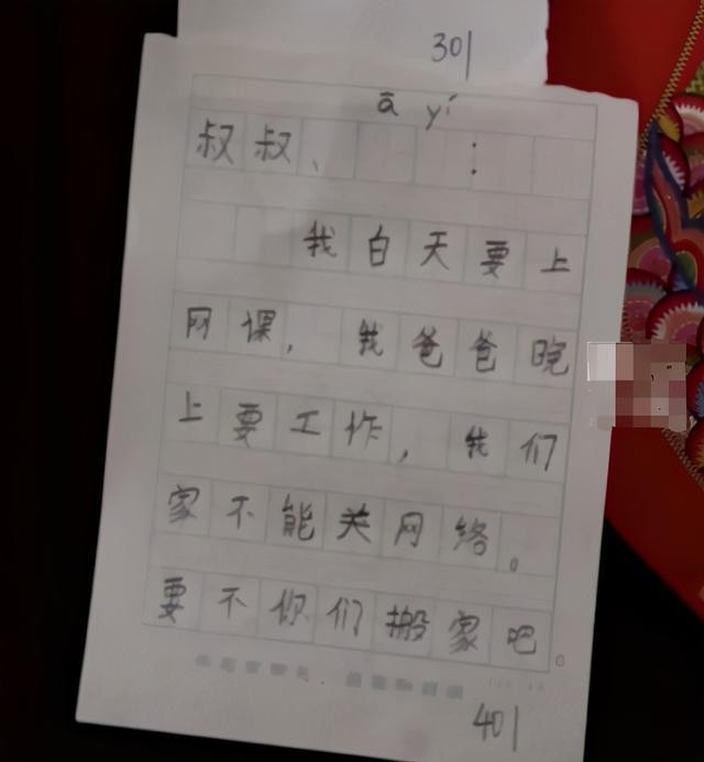 全家看後相當傻眼,隨後孩子立即強勢寫了一張紙條反貼回去。上面寫道,爸爸晚上要在家加班,自己白天還要上網課,WiFi不能斷,並在結尾說道「要不你們搬家吧」。