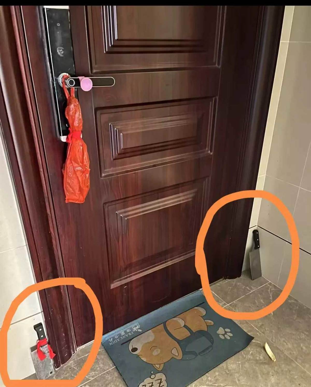 一走近,真的嚇了一跳。只見鄰居家大門兩側,竟然各立著一把菜刀,刀刃還朝上,在夕陽照射下反著冷光。門把上則掛著一個紅色袋子,上面綁著一條鮮紅的繩子,隨風晃來晃去,看了讓人全身不太舒服。