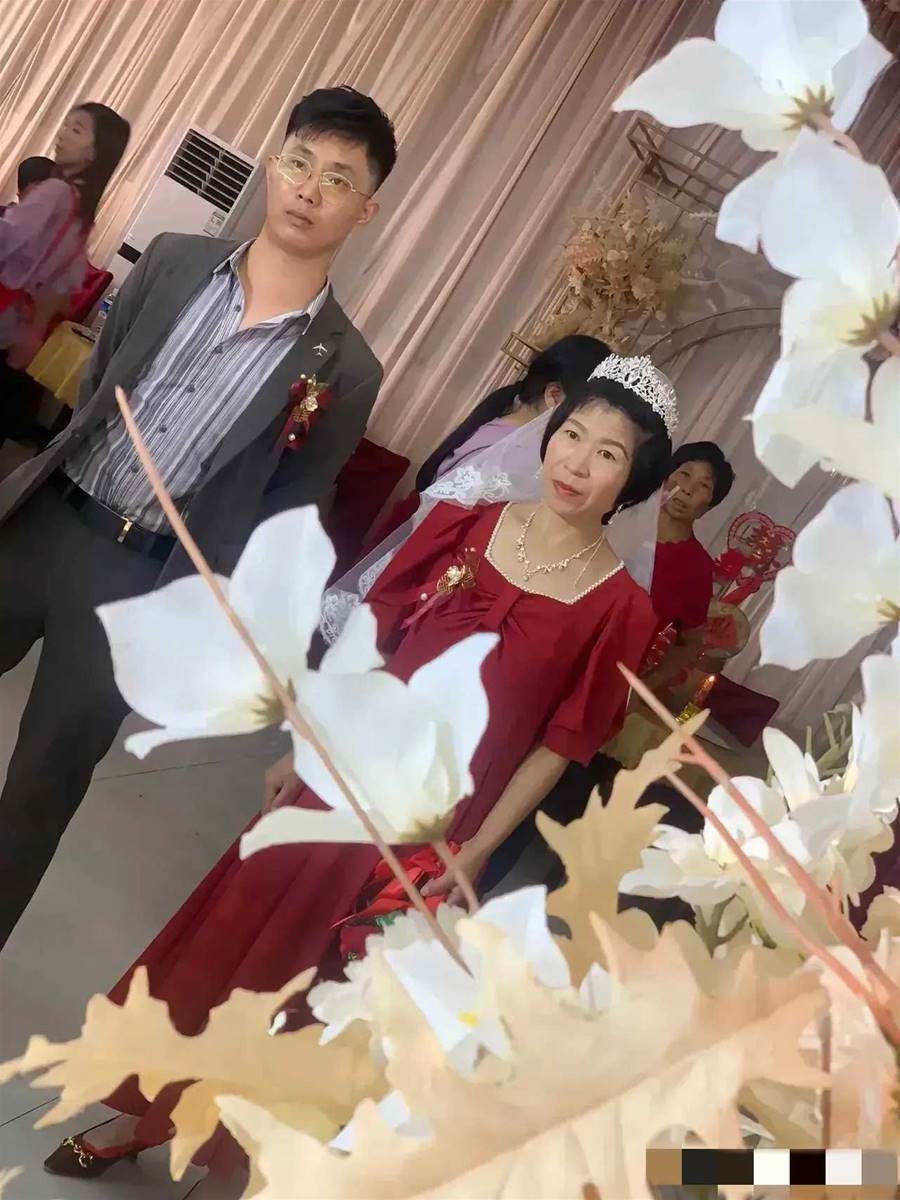 當鏡頭轉向身旁的新娘時,現場氣氛出現了巨大的反差。新娘穿著大紅色的中式禮服,頭戴潔白婚紗,雖然妝容精緻,但明顯看得出與新郎有著巨大的年齡差距。
