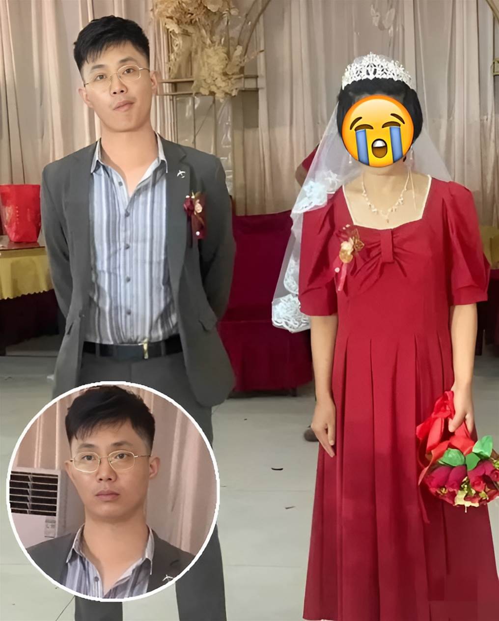 照片中,新郎穿著一身筆挺的灰色西裝,身材挺拔且長相清秀,正值人生的大好年華。然而,與一般婚禮上喜氣洋洋的氛圍不同,新郎自始至終沒有露出半點笑容: