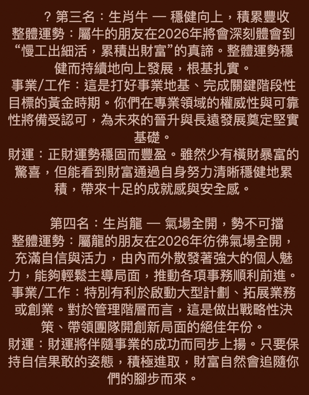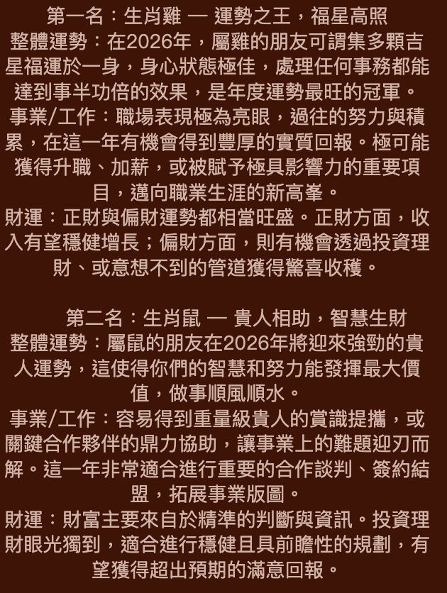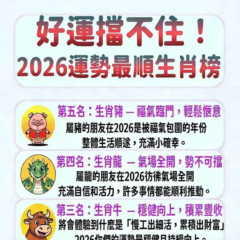 2026年運勢最順生肖排行! Posted by ALICE 一月 29, 2026 . . . . . . . . . . . . . . . . . . . . . . . . . . . . . . 閱讀全文 (2) ALICE 一月 29, 2026