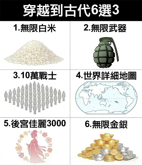 每個人心中都藏著一個理想世界。最近網路上瘋傳一張「穿越古代6選3」的測試圖,選項包含無限白米、無限武器、10萬戰士、世界詳細地圖、後宮佳麗3000以及無限金銀。這簡單的六選三抉擇,其實正悄悄揭露你內心深處最渴望的權力與安全感。