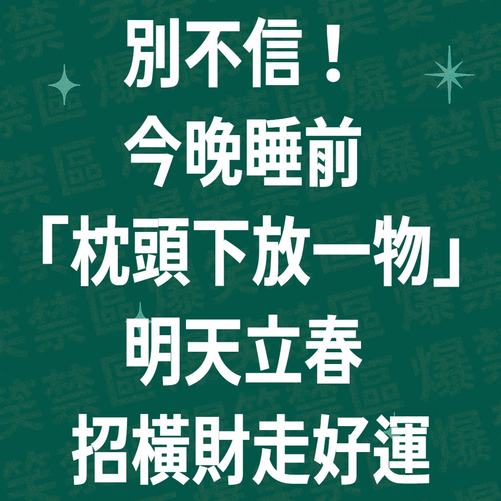 在玄學中,立春前的夜晚稱為**「交運夜」**。當妳入睡後,妳的身心靈處於最放鬆、最沒有防備的狀態,這時候在枕頭下放置特定物品,能產生「同頻共振」的效果。這就像是在妳的運勢種子裡預先埋下財富的基因,等明天立春第一道陽光灑下,好運就會破土而出!