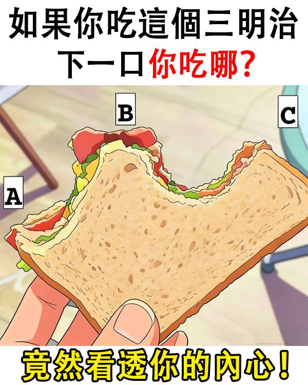 內心解析:規則對你來說只是參考建議。你隨遇而安,性格極其豁達。你認為三明治怎麼吃不重要,重要的是現在「我很餓」而且「很好吃」。