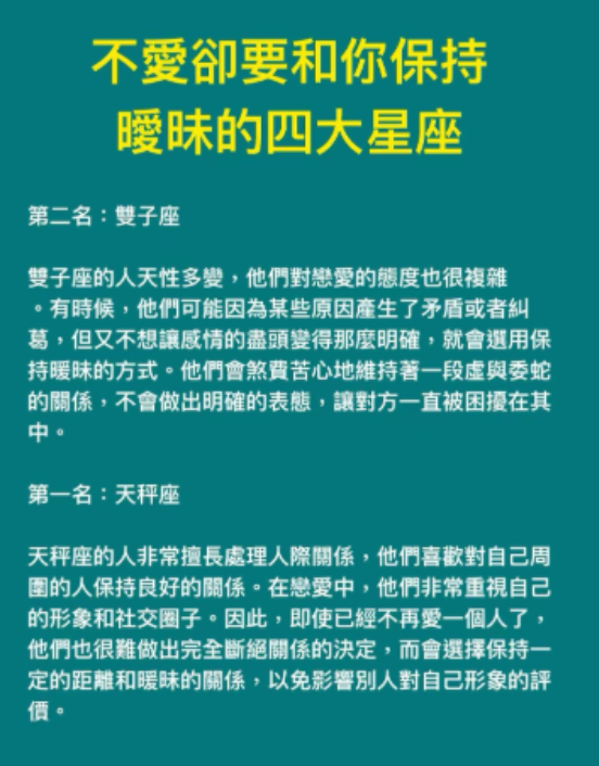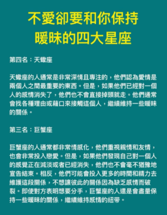 不愛卻要和你保持曖昧的四大星座 Posted by dora 二月 6, 2026 Post by @i_lovememe520 View on Threads 延伸閱讀————————- 歡迎來下水道觀看更多都市傳說👉https://lihi3.cc/c5H8h 想知道財運狀況嗎?免費測驗>>>>https://lihi.cc/Ozo8m 延伸閱讀———— 出軌的女人,最常去的「這三個地方」!實在很準! 無論是男人,還是女人出軌都有固定的地方。今天我們來談談女人出軌時,常去的三個地方。 第一,酒吧。 男人喜歡在這獵艷,女人喜歡在這裡勾搭。酒吧是女人經常出軌的地方,昏暗的燈光,喧鬧的音樂,讓人意亂。 第二,旅館。 這個地方大家都懂得,出軌的人一般會選擇此地溫存,乾柴烈火,一碰就著。 第三,私人會所。 這種地方比較隱秘,一般人很難找的到,她也是為了讓你找不到這個地方才選擇此地的。 出軌一時爽,餘生火葬場,不要輕易出軌 閱讀全文 (432) dora 二月 6, 2026