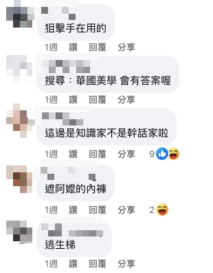 不少網友開玩笑地猜測:「偷情專用梯」、「這樣才會增加房價」、「樓上到樓下比較快」、「小王方便從屋外滑行下樓」、「狙擊手在用的」、「遮阿嬤的內褲」、「問成龍,他很常溜下來」、「讓小偷爬不上去」。
