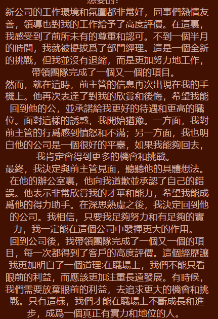 你在認知事物時,更看重事物與環境之間的聯系性,這意味著你的情緒風格屬于邏輯型。你對于情緒的表達非常準確,明白為何而喜,為何而憂。并且可以很好的控制自己的情緒,不會讓情緒控制自己的意志。你有著理智的頭腦,沖動在你身上是不存在的。你的行事風格有著很強的目標性,不會漫無目的的去做一件事。