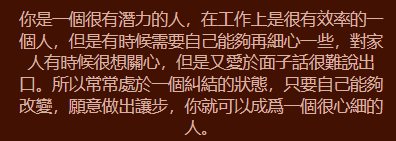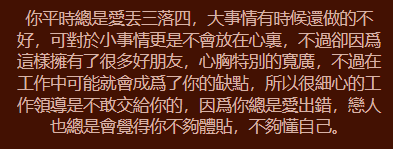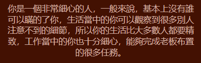 在這種狀況下的人常常經歷精神上的困惑和矛盾。選擇這個選項的男性,雖然他們以外在的平靜和自制力壓抑了內心的焦慮,但是這樣的人就像隱藏在平靜海面下的波濤洶湧。你永遠不知道他心裡在想什麼、會做什麼事,就像定時炸彈一樣,隨時都有可能爆炸。如果是女生選擇這一選項的話,他們雖然不會因為小事爆發,但是卻會將負面情緒藏在心裡,直到忍不住的時候,將所有情緒發洩在另一半身上。雖然這類型的人情緒起伏比較大,但是他們其實是很有創造力的類型,而且對很多事情有自己獨到的見解,很多科學家、發明家都是這類人。