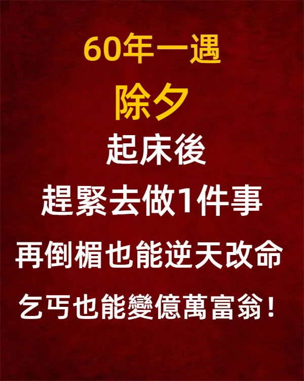 每年除夕,家家戶戶忙著圍爐、貼春聯、迎新年,但你知道嗎?民間其實流傳一個「60年才輪一次」的超強開運時刻,只要把握住這一天早上起床後做對一件事,就算過去再衰,也有機會直接翻身改命!