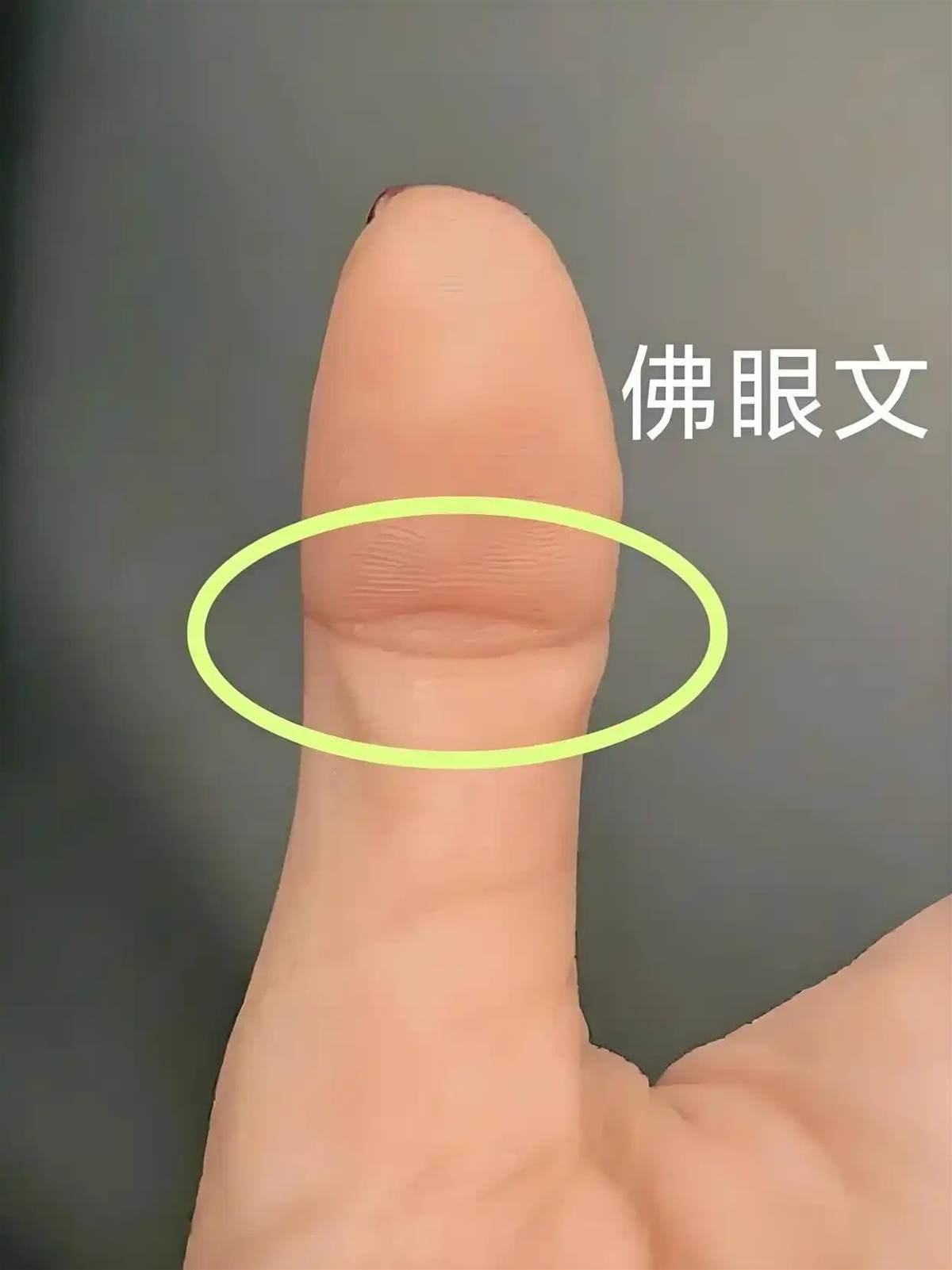 · 大拇指根部有「佛眼」:在大拇指第一個指節處,如果指紋形成一個類似眼睛的閉合圈狀紋路,稱為「佛眼」或「孔子目」。此紋路代表此人慧根深厚,記憶力、領悟力超群,尤其對古典智慧、前世帶來的知識有天然的親和力。