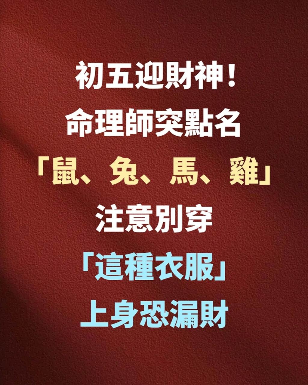 命理師特別針對 屬鼠、屬兔、屬馬、屬雞 這四個生肖發出緊急提醒:今天迎財神時,若穿錯「這類衣服」,不僅會驚動元神,更會形成強烈的「漏財格局」,恐讓您今年剛接引的財氣瞬間化為烏有!