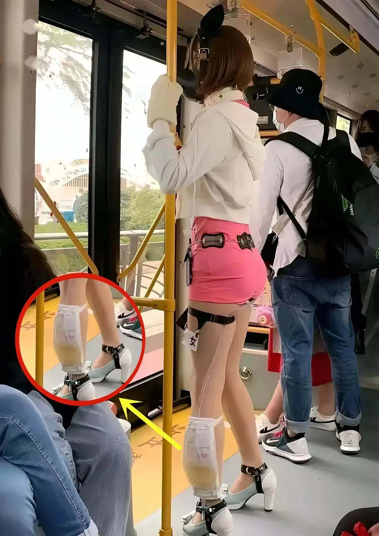 根據原PO的描述,他是在上班途中偶遇一位女生。那女孩的穿搭真的很吸睛:白色上衣、粉色超短褲,加上腿上綁帶,視覺衝擊超強。最特別的是——她的小腿上居然還掛著一個袋子。
