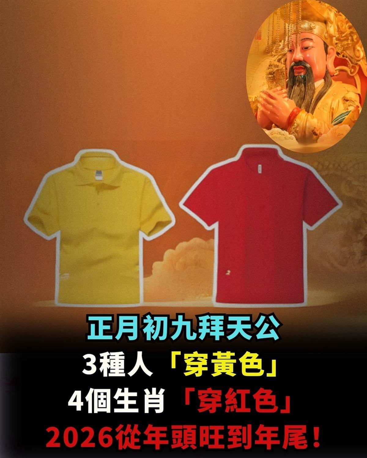 所以,如果你今年打算拜天公,就一定要在初九這天調整好自己的狀態!民間風俗認為,適合的顏色能影響氣場,而顏色的選擇尤其不能忽視!2026年是**丙午年**,火旺之勢尤其強大,穿對顏色不僅能助好運落地,更能避開潛在的阻礙與不順。