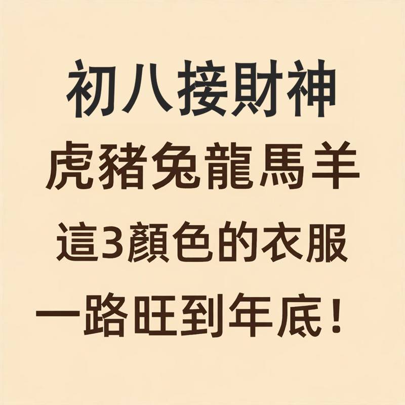 大年初八是「順星接財神」的重要日子,象徵新一年的財氣正式啟動。這一天的穿著顏色,會放大整年氣場與財運流動。尤其是 虎、豬、兔、龍、馬、羊 六大生肖,今年初八若穿對顏色,財運、事業運、貴人運都有機會一路旺到年底。