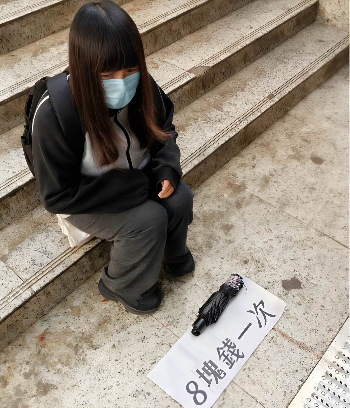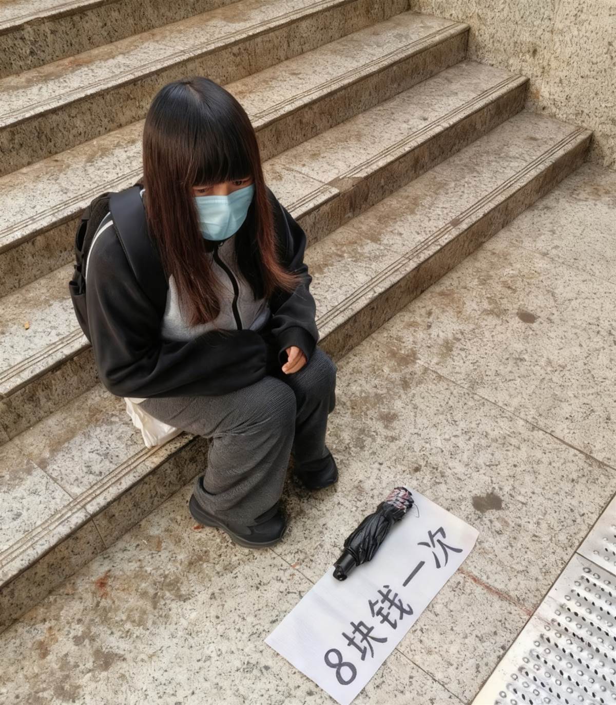 在市中心的商業區,有個露天樓梯口。一名戴著藍色口罩的年輕女子,就這樣坐在冰冷的花崗岩階梯上。她面前放著一張白紙,上面用黑色大字寫著「8塊錢一次」,特別顯眼,旁邊還擺了一把從頭到尾都沒撐開過的黑色雨傘。乍看之下好像是在「出租雨傘」,但其實,這正是現在流行的一種新型乞討手法。