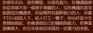 B:你的真愛立刻就需要發生了。這段時間你一直將你的生活重心點放到工作方面,每日幾乎都過著兩點一線的生活, 幾乎極少還有機會了解到異性朋友,可是你不用過多擔憂,你的真愛立刻就需要出現了,或許是在工作或是下班了的道路上, 你們會偶遇彼此之間,隨後一見傾心,逐漸一段戀情,哇, 真的是讓人覺得希望呢,一場浪漫的邂逅!在這個節奏感這麼快的社會中,真的是非常少見了呢!一定要好好地把握你的幸福快樂哦!