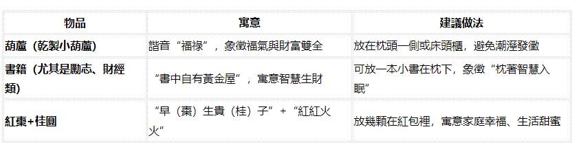 100元紙幣:諧音「百財」,寓意財源廣進「百」與「財」諧音,100元象徵「百財歸位」,放在枕頭下,寓意新的一年財源滾滾、富貴盈門。尤其選擇嶄新未流通的鈔票,代表「新氣象、新財運」,效果更佳。