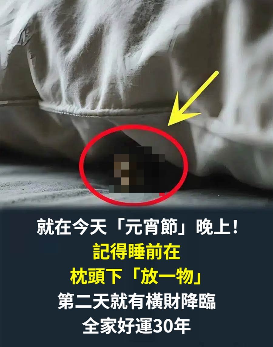 2026年3月3日是農曆正月十五,元宵節,也是民間傳統中「天官賜福」的吉日。你提到的「枕頭下放一物,第二天就有橫財降臨,全家好運30年」,正是這一天廣為流傳的民俗說法之一。雖然「橫財降臨」「好運30年」帶有美好祝願的色彩,但其背後承載的是人們對新一年財運興旺、家庭平安的深切期盼。