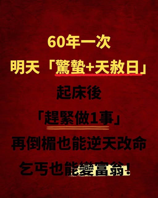 ⚡60年一次!就在明天!2026年3月5日「驚蟄」,起床後趕緊做這 1 件事,再倒霉也能逆天改命!🐉💰📢 2026年3月5日是農曆「驚蟄」,這是一年中最強的轉運日之一! 「驚蟄」代表萬物甦醒、陽氣回升、財運復甦,這一天如果做對關鍵動作,不僅能轉運開財,還能擺脫厄運,迎來一整年的好運!🔥 60年才一次的超強能量日,千萬別錯過!只要起床後趕緊做這 1 件事,就能讓財運翻身、好運連連!