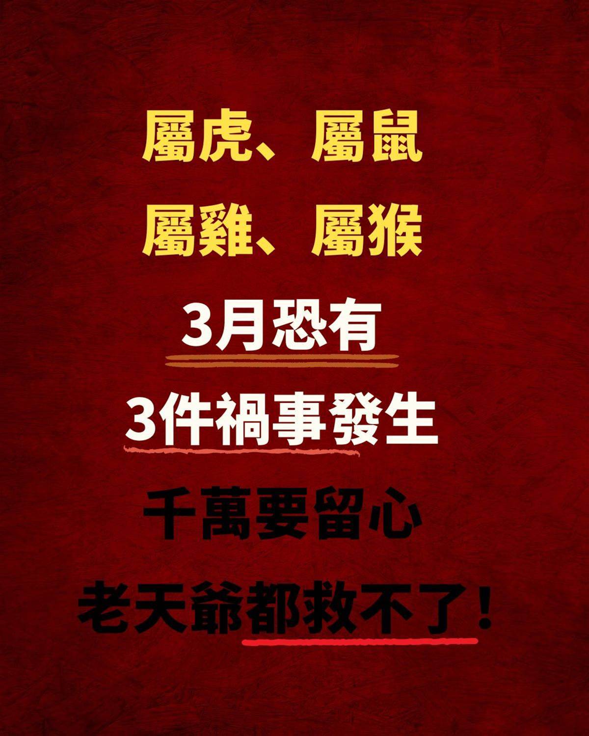2026年3月,是這四大生肖的「年度考驗月」。屬虎、屬鼠、屬雞、屬猴的朋友,請務必提高警覺,謹守財庫、顧好健康、慎言慎行,平安度過這個多事之春,迎接後續的轉運時機!