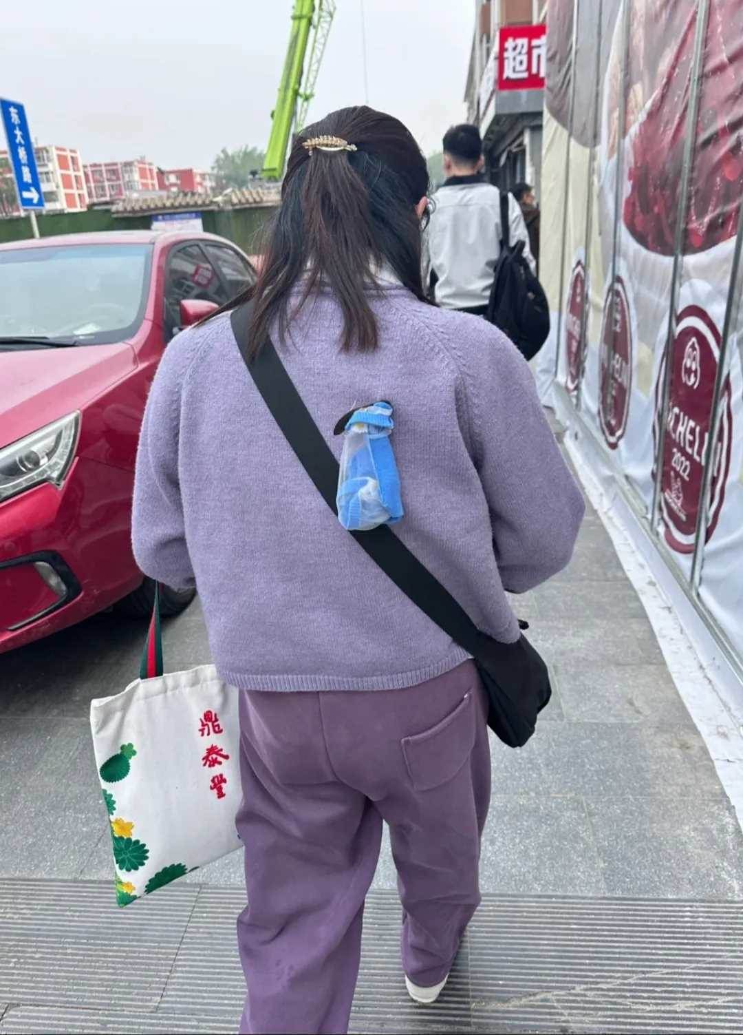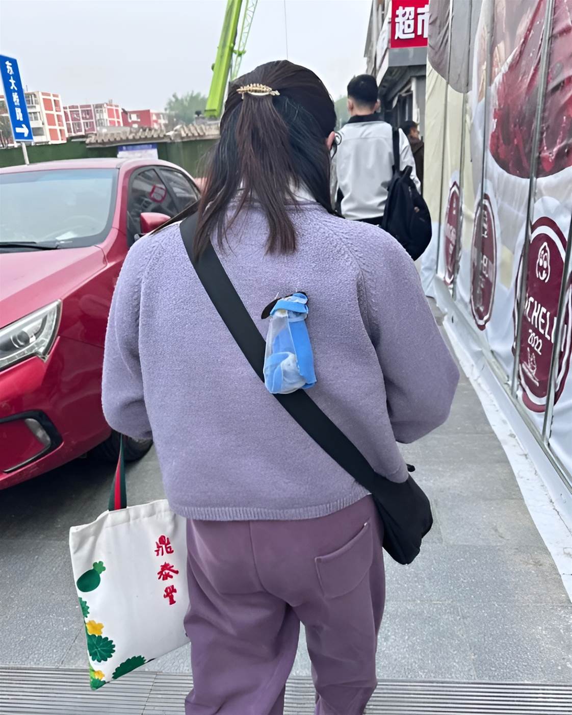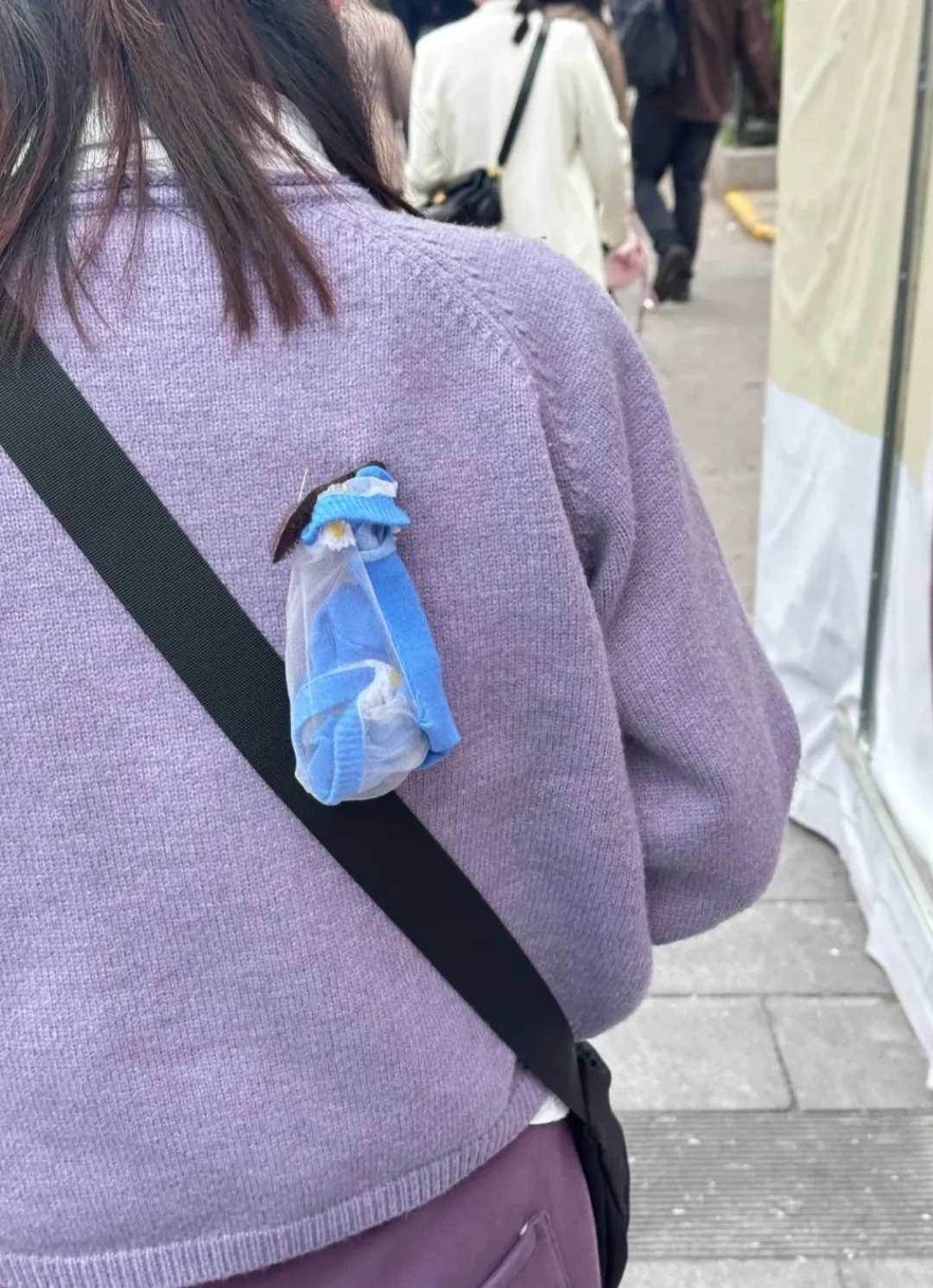 事情發生在一條繁忙的街道上。一位穿著紫色毛衣的女子正匆匆前行,肩上斜挎著一個黑色的包。然而,包上掛著的一個透明塑料袋卻格外引人注目。袋子里裝著一件藍色的物品,遠遠看去,讓人不禁浮想聯翩。