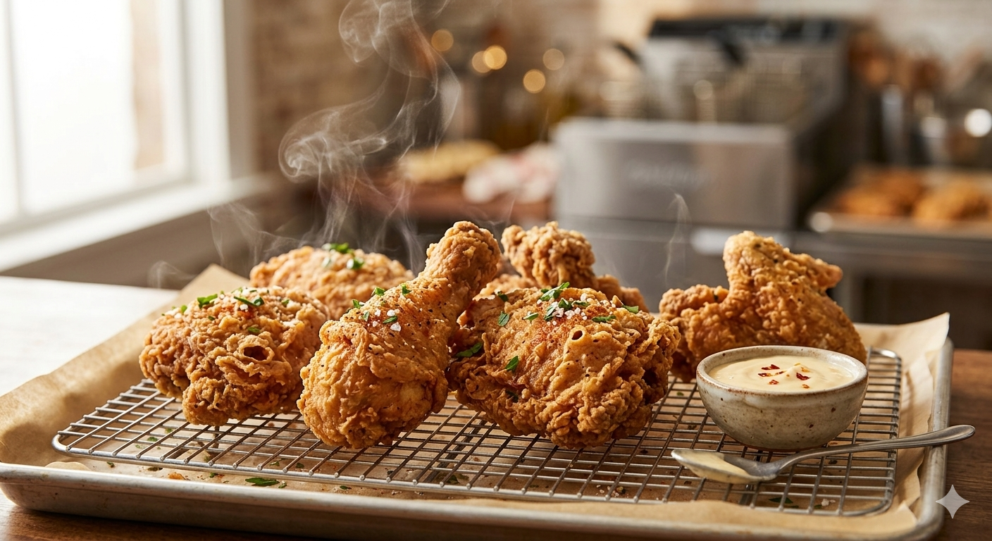 B. 剛出爐的香脆炸雞(鮮嫩多汁、外皮酥脆)