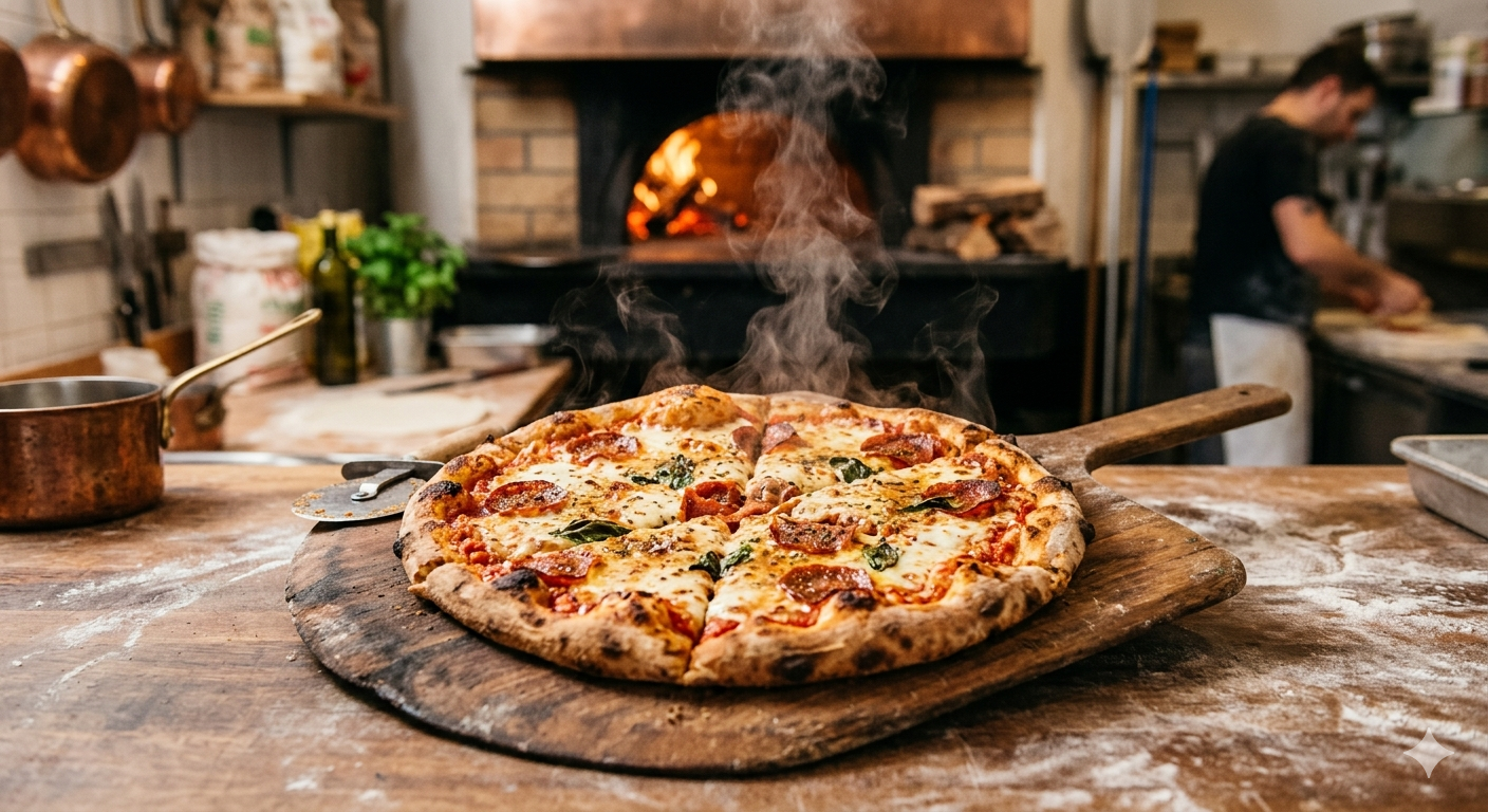 D. 冒著熱氣的現烤披薩(牽絲起司、豐富配料)