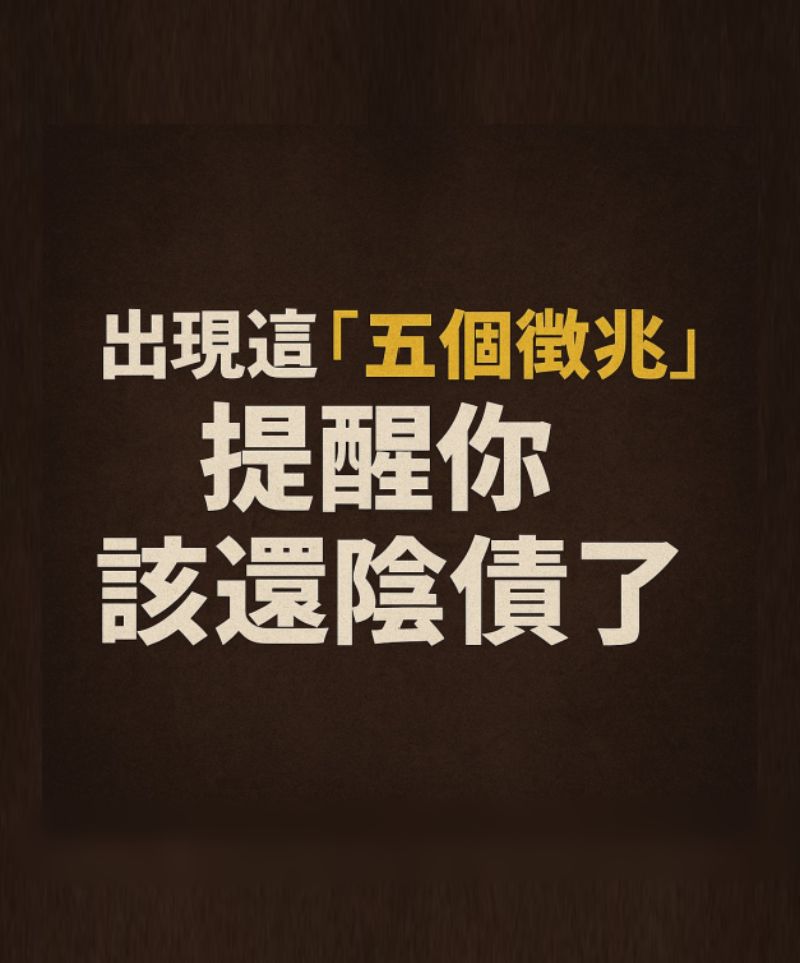 出現這「五個徵兆」提醒你該還陰債了 Posted by 小紀 三月 16, 2026 所謂「還陰債」,是在民間信仰中,一種認為人今生受苦或不順,是因為前世有未償還的債務或業力,需要透過祭拜、誦經、法會等方式來還清,以求平安順遂。 雖然科學上無法證實這些說法,但在民俗文化裡仍被不少人信奉。 以下是民間流傳常見的「需要還陰債」的五種徵兆: 1. 運勢長期低迷、不順 無論怎麼努力都事倍功半 工作、感情、財運持續不順 常有小人作祟,機會總是擦身而過 2. 常做惡夢或夢境詭異 頻繁夢到陌生人、墳墓、黑白無常、亡者等 夢中感到壓力、恐懼或驚醒 感覺夢境像是有「訊息」或「警示」 3. 身體常出狀況,醫不好 小病不斷,找不出明確病因 常感疲憊、虛弱,精氣神不足 醫生也無法有效改善病情 4. 家運不安、衰事連連 家中常發生爭吵、意外或破財 成員莫名間不合、病痛或事故頻發 明明該順利的事情總被阻擋 5. 易被陰靈干擾、卡陰現象 感覺身邊有人、冷風、異味 無來由的心悸、恐懼感或被壓 請過宮廟或師父查過,認為有靈性干擾 如果你或身邊的人出現這些狀況,民俗上會建議: 前往有信仰的宮廟或寺廟請示 由專業法師或乩身進行「還陰債」儀式 配合誦經、供品、迴向等方式 閱讀全文 (345) 小紀 三月 16, 2026