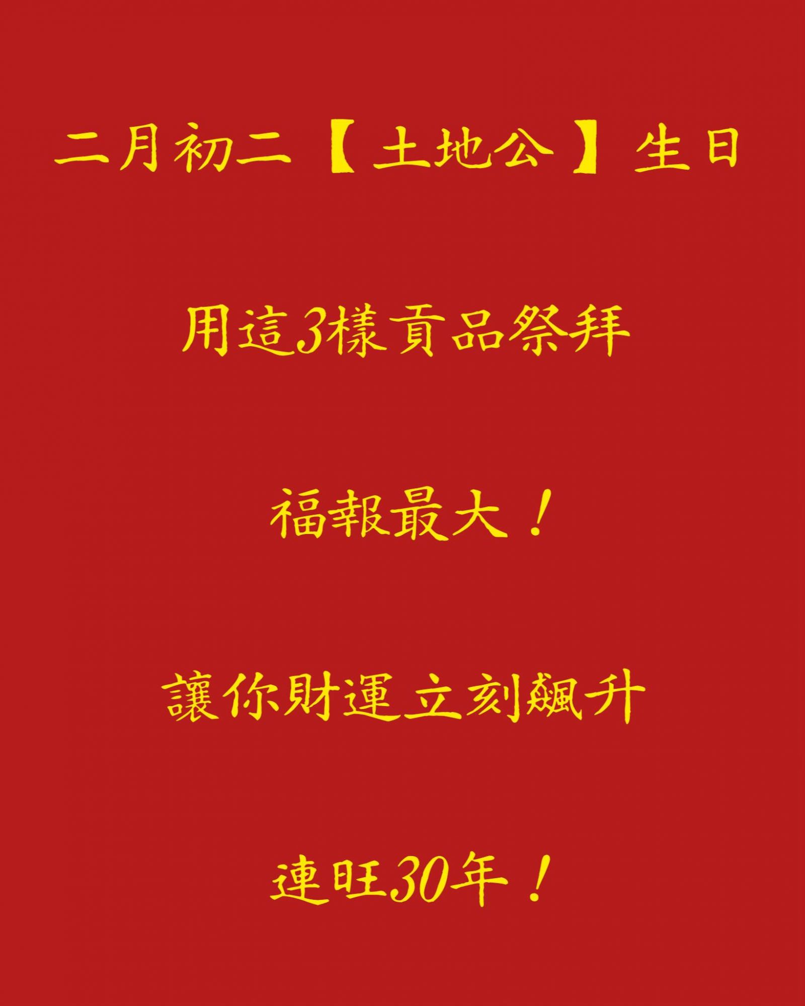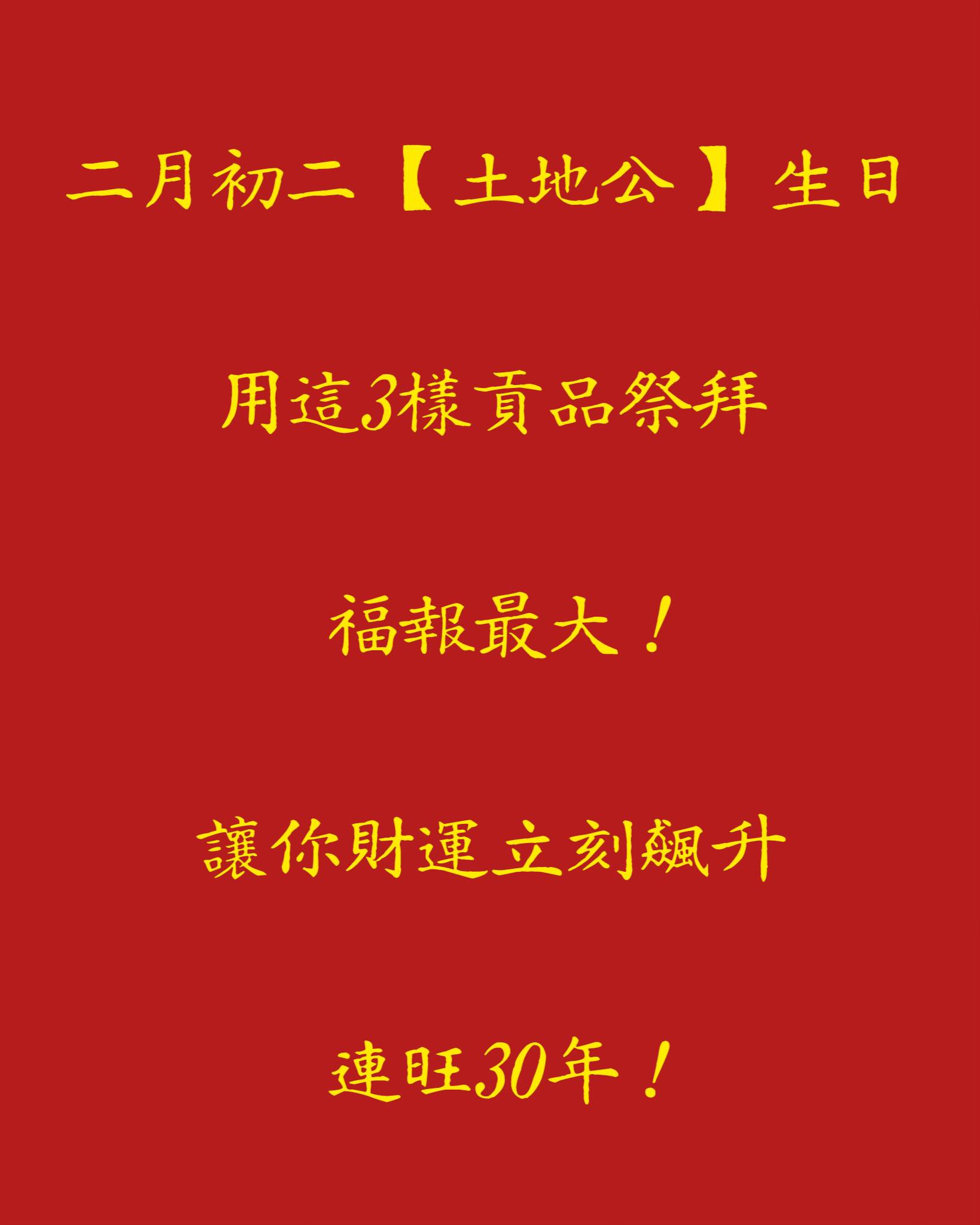 每年農曆 二月初二,是民間非常重要的日子——也是土地公的生日。土地公又被稱為「福德正神」,在民間信仰中掌管地方福報、財運與家宅平安,因此這一天被視為求財、補運、轉運的最佳時機。許多老一輩都說,如果在這天誠心祭拜,能夠為自己與家人帶來長久的好運,甚至有「旺運數十年」的說法。