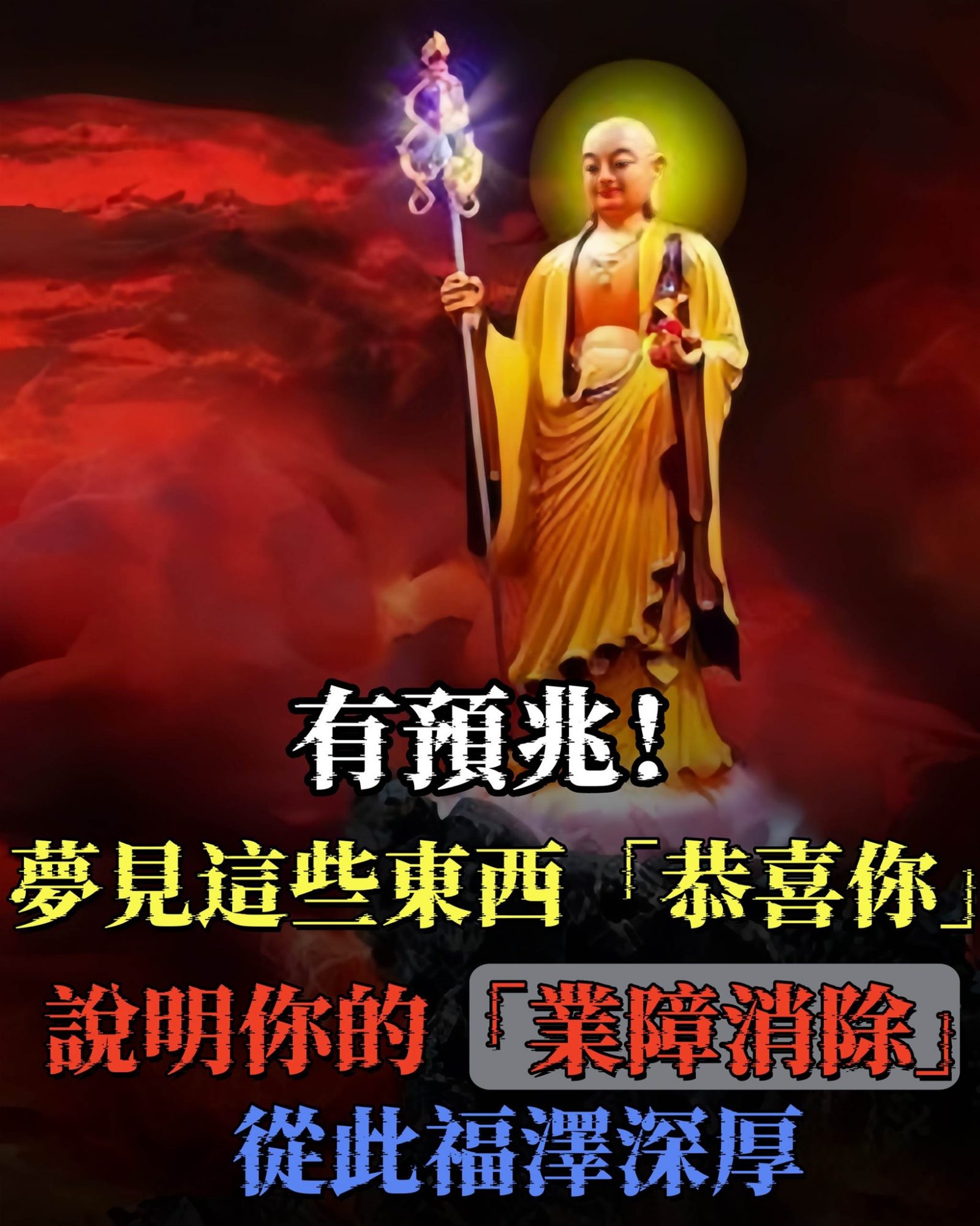 另外呢比如說夢見水,如果夢見水很清,又很大,那就更好,或者夢見自己下到水裡,更好,這都是消除都是淨除業障的標誌。還有一些比方說,夢見自己從監獄裡面逃出來,夢見渡過大河,夢見自己爬山爬到山頂,或者是夢見自己同一個黑人打架,並且還打贏了,或者夢見自己拜佛、到廟裡面,見到那個香爐在冒煙,然後到香爐那裡看,香爐裡面是空的,沒有什麼東西,這些都是屬業障減輕的徵兆。