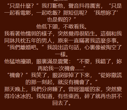 在這種狀況下的人常常經歷精神上的困惑和矛盾。選擇這個選項的男性,雖然他們以外在的平靜和自制力壓抑了內心的焦慮,但是這樣的人就像隱藏在平靜海面下的波濤洶湧。你永遠不知道他心裡在想什麼、會做什麼事,就像定時炸彈一樣,隨時都有可能爆炸。如果是女生選擇這一選項的話,他們雖然不會因為小事爆發,但是卻會將負面情緒藏在心裡,直到忍不住的時候,將所有情緒發洩在另一半身上。雖然這類型的人情緒起伏比較大,但是他們其實是很有創造力的類型,而且對很多事情有自己獨到的見解,很多科學家、發明家都是這類人。