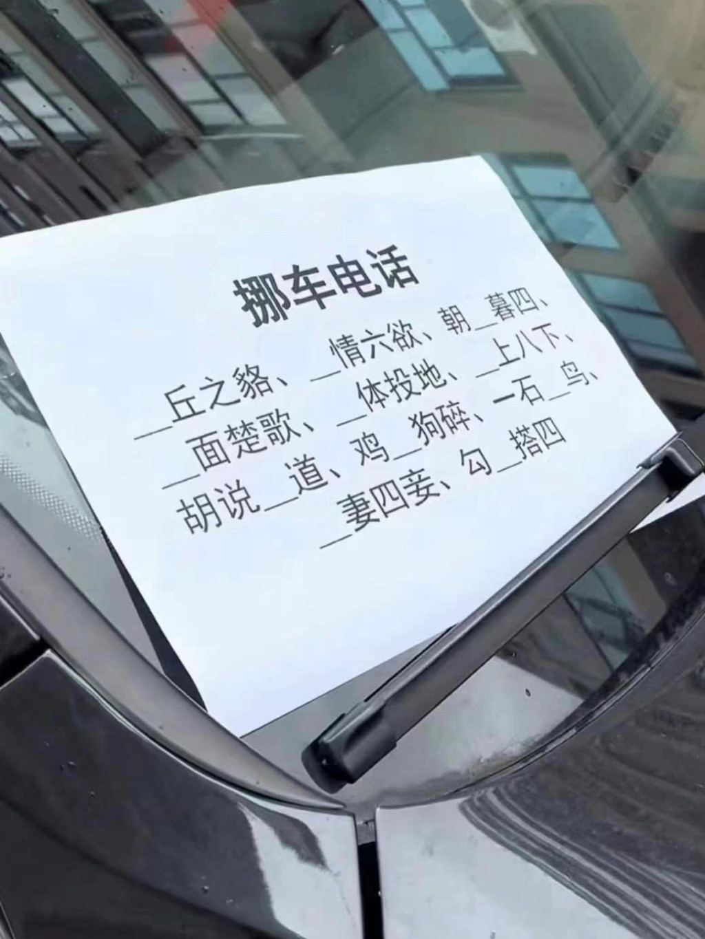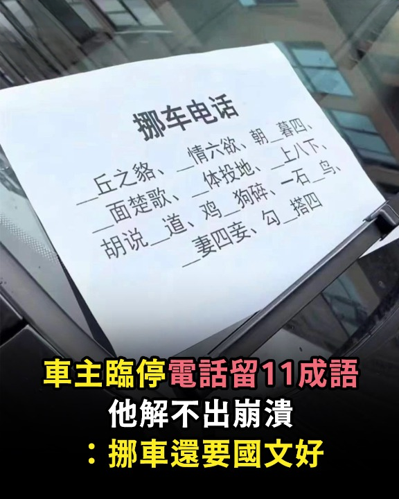 沒錯,是成語,而且還是「缺字版」。總共有11個成語,每個缺的字剛好都是數字,要全部解出來,才能拼出車主的電話號碼。