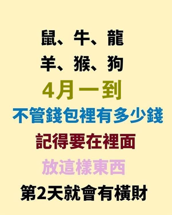屬【鼠、猴】:(申子辰三合水局) 這兩個人在 4 月是「財源滾滾」的格局。放入開運物後,明天的直覺力會異常靈敏,特別容易在投資、抽獎或副業上獲得意外驚喜。