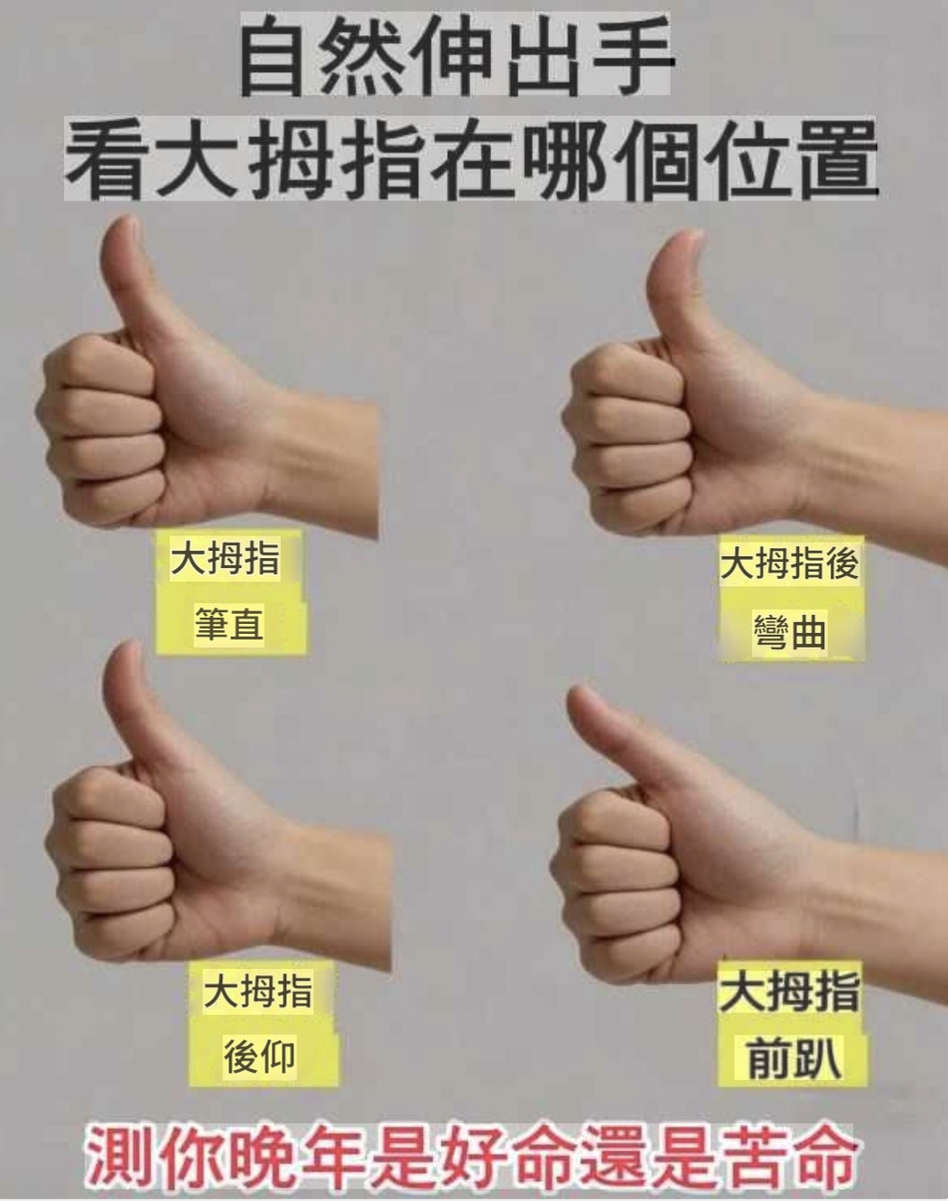 晚年運勢隱喻:你的觀察習慣甚至能暗示你的未來。據說「自然伸出手」時的大拇指位置,也能預測一個人的晚年運勢。 越是能專注於當下微小細節的人,通常生活掌控度越高。