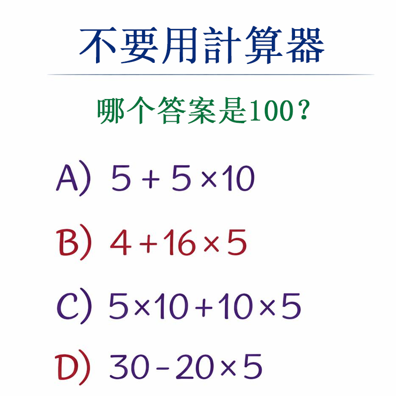 這是一場針對大腦邏輯與反應速度的「除鏽測試」!在數位時代,我們過度依賴計算器,導致基礎的四則運算規則變得模糊。 圖片中這道看似簡單的選擇題,其實暗藏了心理陷阱。