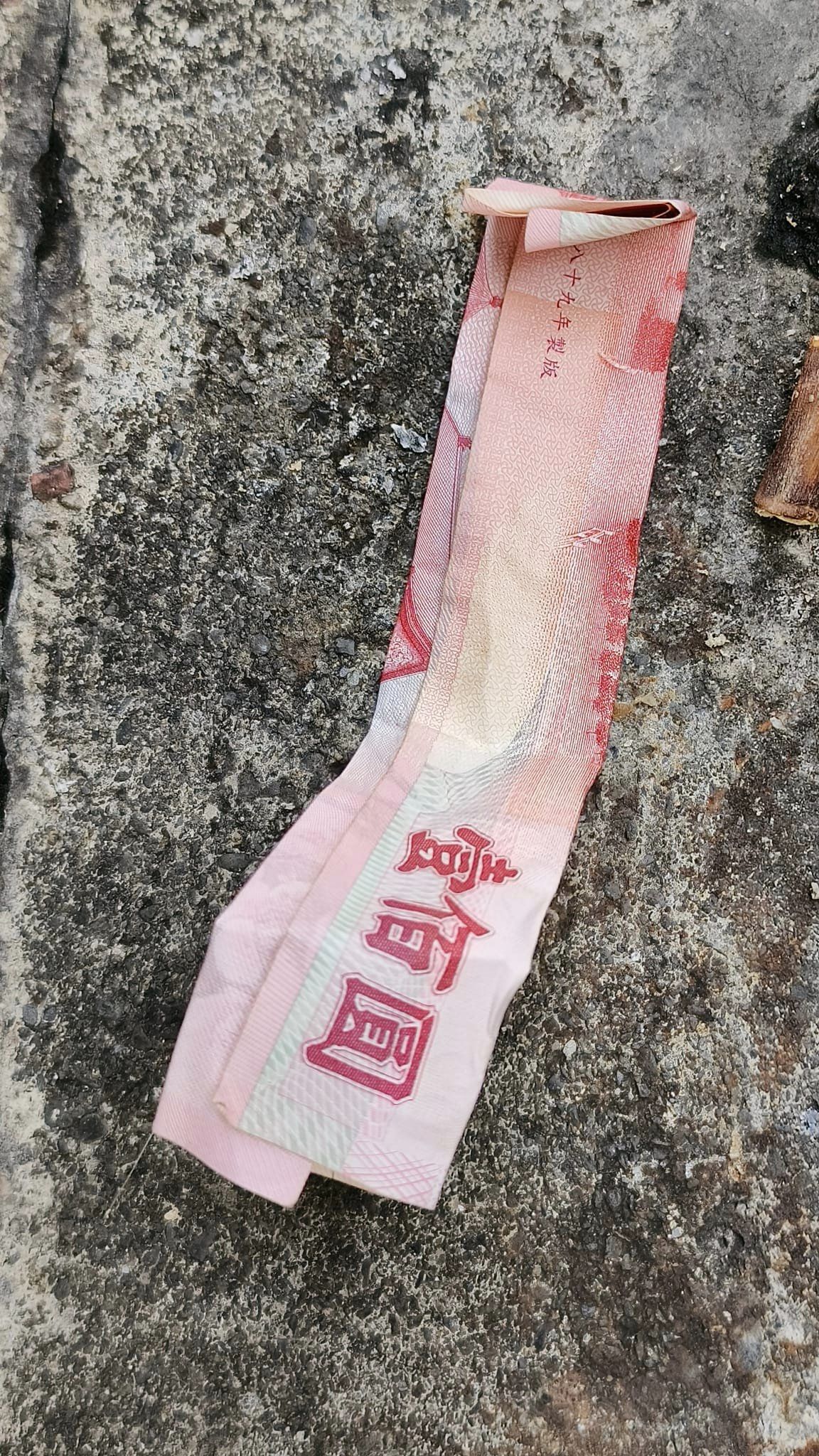 某天出門時,在自家門口地上看到一張「摺起來的100元紙鈔」。
