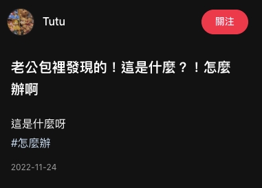 她緊張地發文求助,直呼:「老公包裡發現的!這是什麼?怎麼辦啊?」語氣中滿滿都是不安,讓不少網友也跟著好奇,到底是什麼東西,竟然能讓人瞬間聯想到婚姻危機。