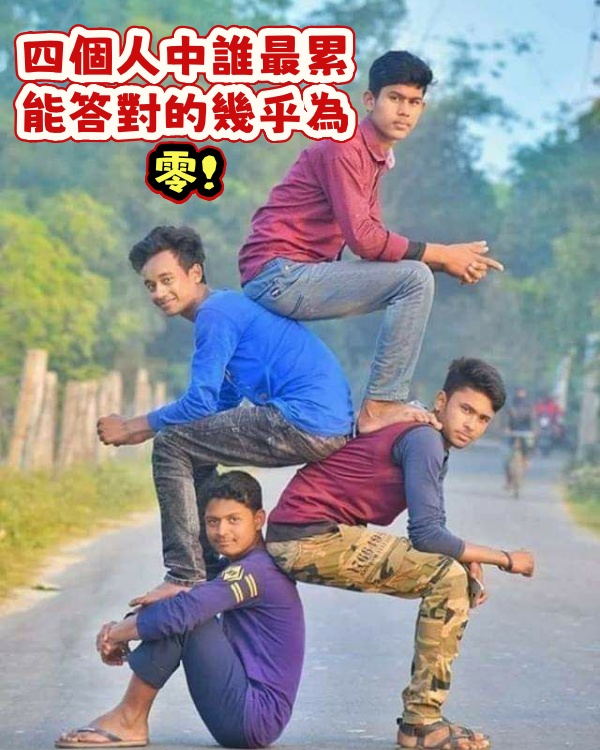 最下方基座的人(紫衣):他才是真正最累的人! 他的身體必須支撐上方所有三個人的重量,且重心完全壓在他的大腿與腳部。這種支撐結構就像一個金字塔,基座承擔了所有的物理負荷。