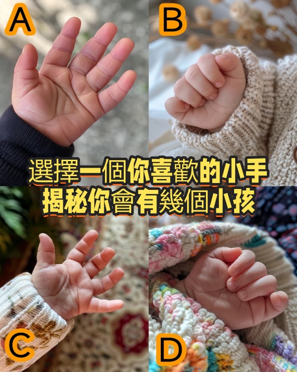 這是一個關於未來家庭與福氣的趣味心理測驗!請憑第一直覺從四張可愛的小手中選出一張,來揭示您的子女緣分: