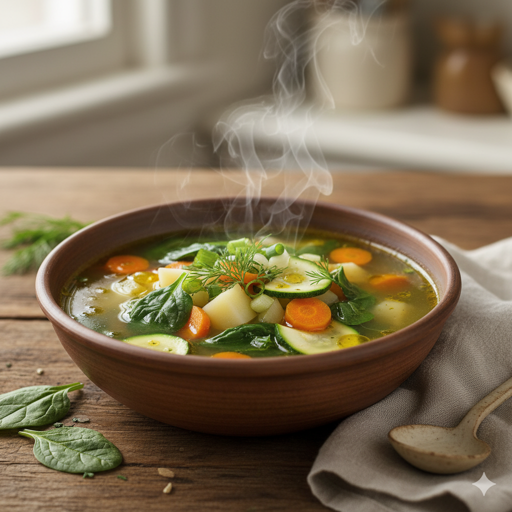 B. 🧘 一碗清淡溫暖的蔬菜湯:清爽、無負擔,讓胃和心靈都得到安撫。