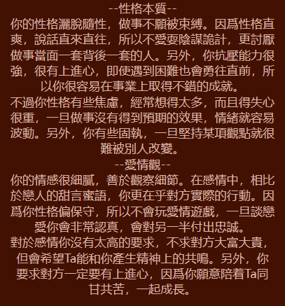 性格解析: 初見你時可能覺得有點高冷或嚴肅,但一旦進入你的內心世界,會發現你無比熱情且充滿力量。你非常有擔當,是朋友們眼中最可靠的避風港。