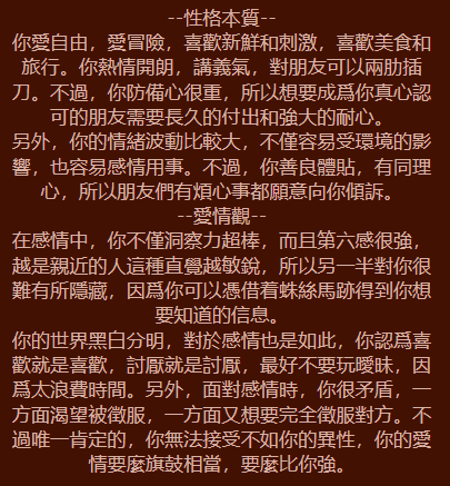性格解析: 你是一個很早就看透生活本質的人。你知道生活有苦有甜(像焦糖),所以你學會了柔軟與圓融。你處事優雅,不愛與人爭搶,反而讓你獲得更多尊重。