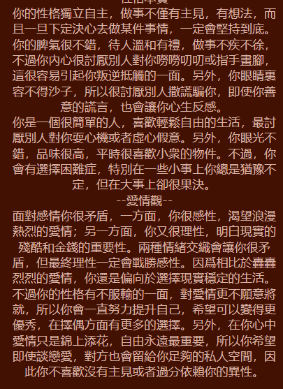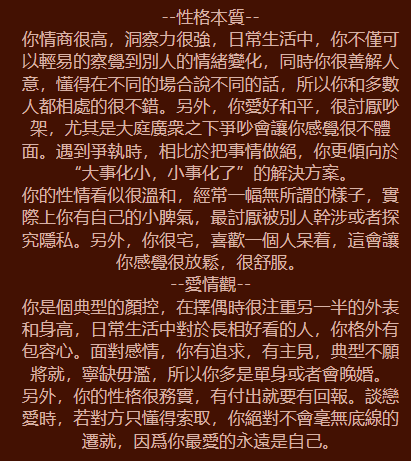 性格解析: 你是一個非常有品味、重視細節的人。你對生活有很高的標準,有時會讓自己活得比較累,但也因為這份堅持,你總能成為人群中閃耀的焦點。