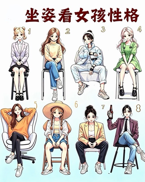 性格:妳對世界充滿好奇心,是一個非常溫暖且樂於傾聽的人。這種坐姿代表妳隨時準備好與人溝通,妳的人緣極佳,身邊的人都願意向妳傾訴心聲。