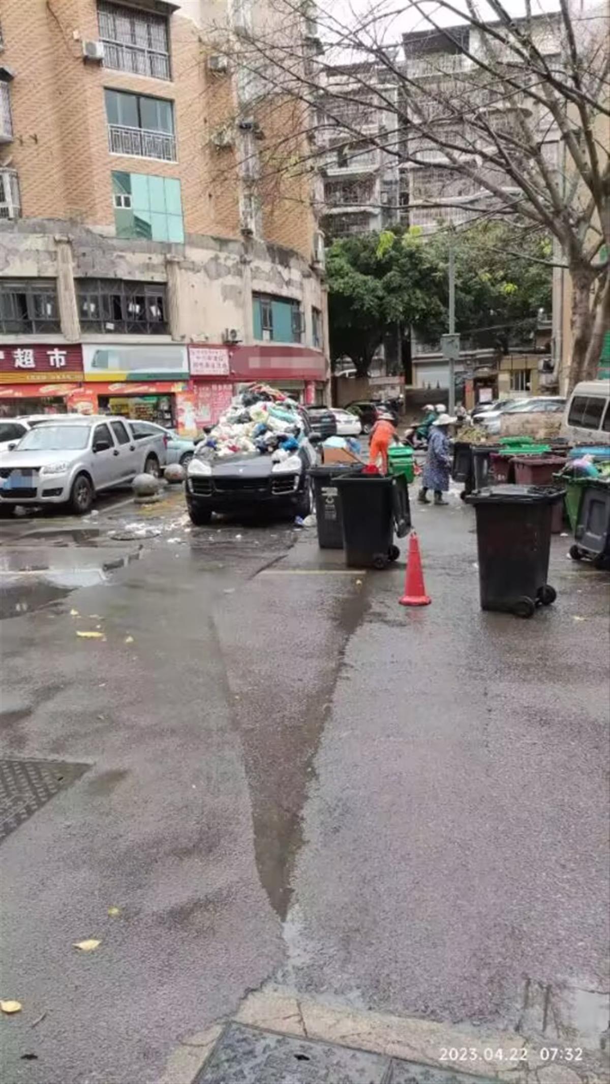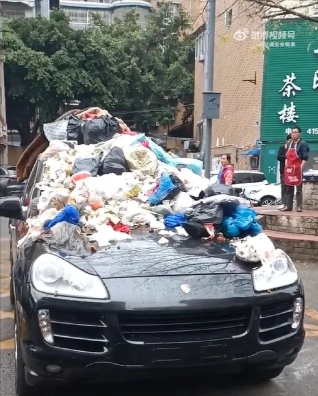 隔天一早,這輛原本氣派十足的名車已經完全變了樣,從車頂到擋風玻璃,全被垃圾覆蓋,畫面相當狼狽。附近住戶表示,早上出門上班時看到這一幕都傻眼,推測車子應該是前一晚就停在那裡,但到底是誰丟垃圾,大家也不清楚。巧合的是,保時捷旁邊剛好就是社區垃圾桶集中處。