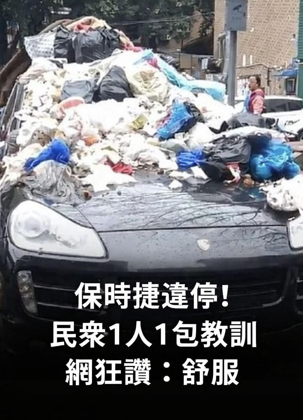 有路過的民眾發現,因為車牌被拆,想檢舉也無從下手,最後乾脆用「最直接」的方式表達不滿——開始把垃圾一包一包丟到這輛保時捷上。